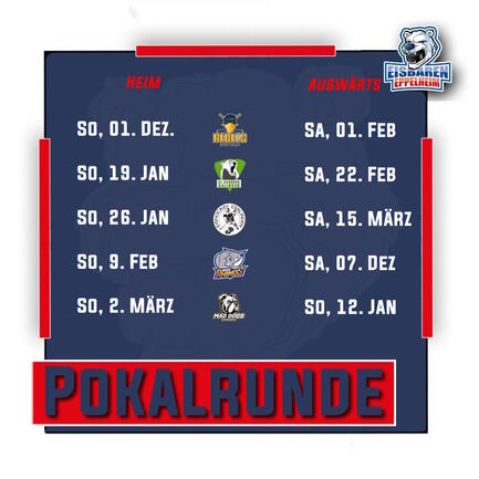 Nach der schweren Gruppenphase geht es für unsere Eisbären nun in der Pokalrunde weiter. Vorbehaltlich eventuell notwendiger Verschiebungen starten wir mit einem Heimspiel gegen die Tabellenführer Stuttgart (4 Siege - 12 Punkte) am 1. Dezember. Mit dem Auswärtsspiel in Hügelsheim (1b) endet das Kalenderjahr 2024 bereits eine Woche später.